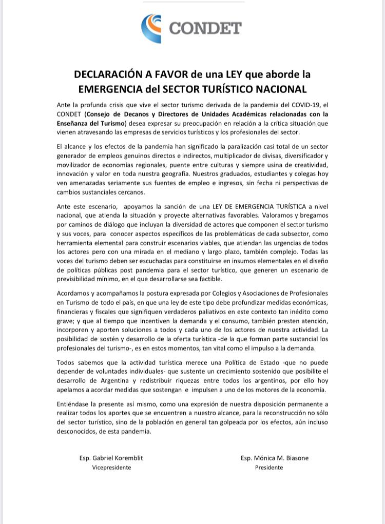 Desde el Consejo de Decanos y Directores de Unidades Académicas relacionadas con la Enseñanza de Turismo (CONDET) emitieron una «declaración a favor de una ley que aborde la emergencia del sector turístico nacional».