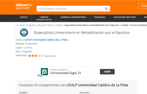 Desde la Comisión de Control del Ejercicio Profesional del Colegio de Kinesiólogos informaron que el curso de «Posgrado de especialista universitario en Rehabilitación por el Ejercicio» que se promociona de forma online no se encuentra vigente ni forma parte de la oferta académica de la UCALP.