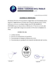 El Colegio de profesionales de la Higiene y Seguridad de la Provincia convocó para el día miércoles 8 de julio, a una asamblea ordinaria para todos los colegiados, con el fin de dar lectura al acta del encuentro anterior y avanzar con varios puntos del orden del día.