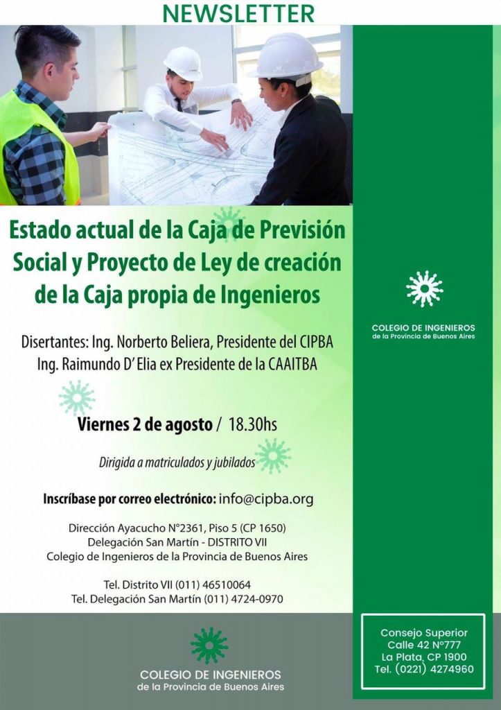 El Colegio de Ingenieros de la Provincia de Buenos Aires realizará este viernes 2 de agosto en la delegación San Martín una charla sobre el sistema previsional vigente, que se inscribe en el reclamo por la creación de una Caja propia.