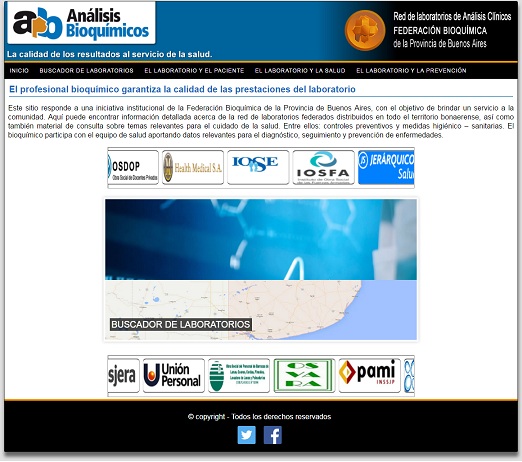 Bajo el lema :“La calidad de los resultados al servicio de la salud” esta página web pública denominada “Análisis Bioquímicos” pretende acercar a la población información detallada referida a la red de laboratorios federados distribuidos en todo el territorio bonaerense, a través de un buscador, así como también material de consulta sobre temas relevantes para el cuidado de la salud, entre ellos controles preventivos y medidas higiénico – sanitarias.
