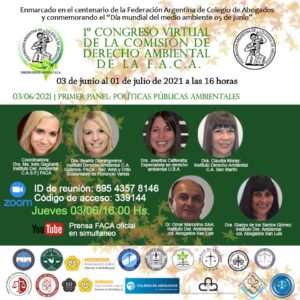 La actividad se enmarca en el centenario de la Federación Argentina de Colegio de Abogados y conmemorando el “Día Mundial del Medio Ambiente 05 de junio”, y se podrá seguir a través de la plataforma Zoom y/o a través del canal de youtube de la FACA.
