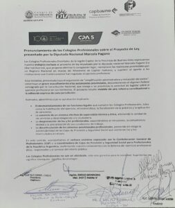 “Advertimos que su aprobación implicaría el desmantelamiento de las funciones legales que cumplen los colegios profesionales”, señala el documento, y subraya que la eliminación de estos organismos pondría en riesgo el control ético, la habilitación del ejercicio profesional y la fiscalización de la práctica, afectando directamente la calidad de los servicios que recibe la ciudadanía.